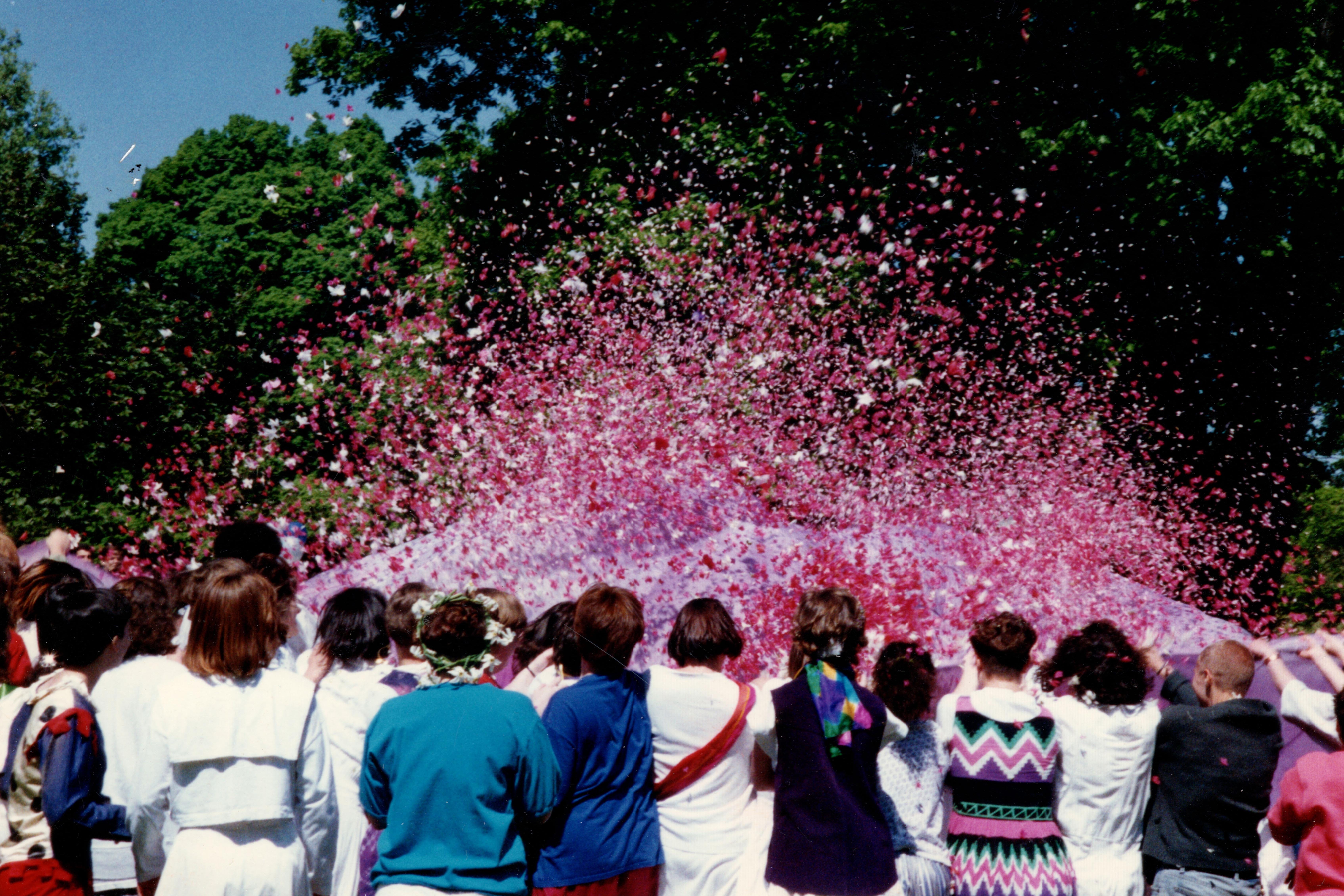 The maypole dance is stately and beautiful and I’m grateful that I had the chance to participate. The mayhole is chaotic and beautiful and everyone can participate. The first photo above shows women bound by patriarchy—represented by toilet paper. The second photo is a parachute filled with cherry blossom petals being lofted into the air by women who have been released from the bondage of patriarchy.